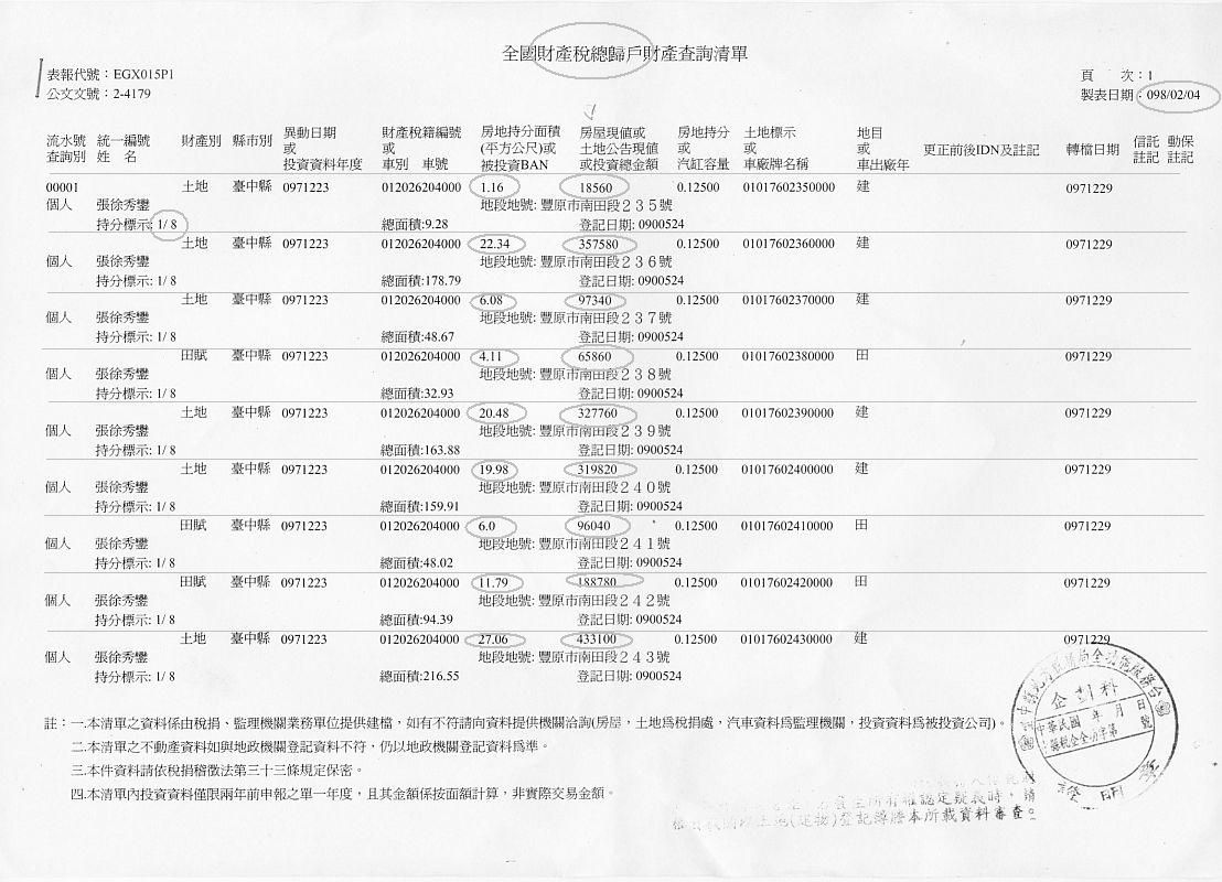 從下面這份98.02.24申請的張徐秀鑾(老嬸婆)「全國財稅總歸戶財產清單」看來: